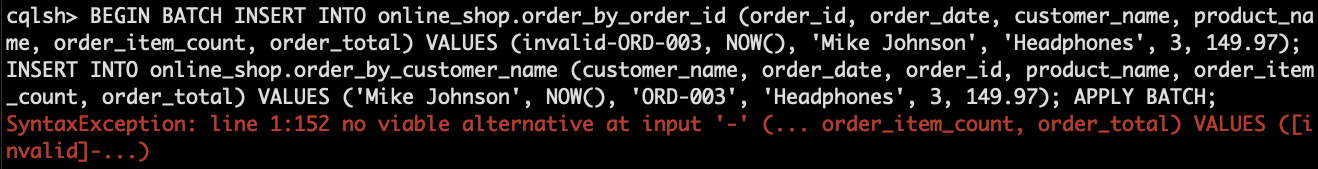 invalid-ORD-003without using logged batches. In this case, one INSERT statement fails and the other executes.