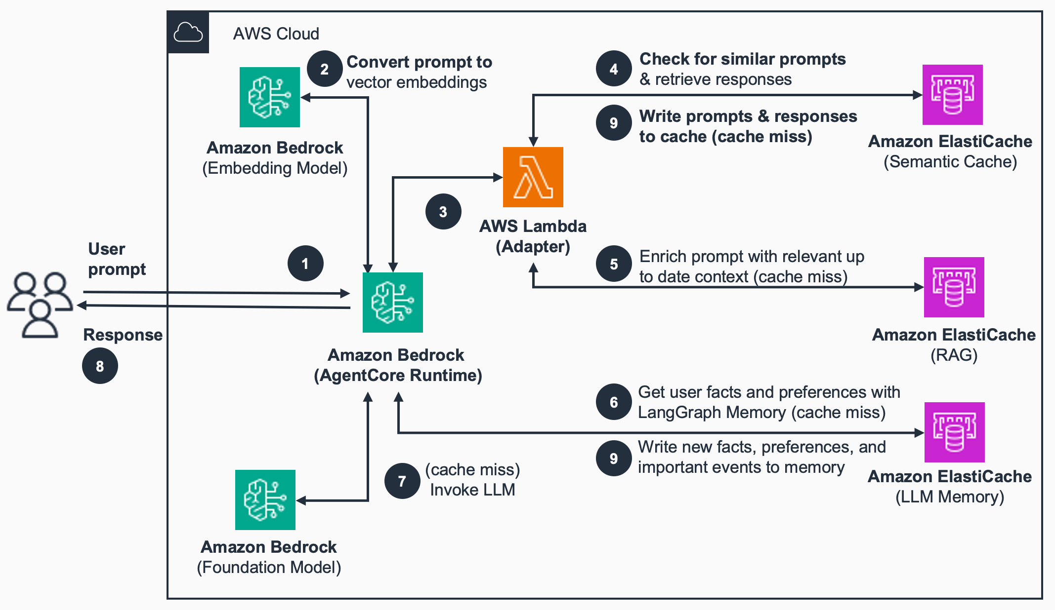 The following diagram illustrates an example architecture using ElastiCache to implement a semantic cache, conversational memory, and RAG to enhance a generative AI application built on Bedrock AgentCore.
