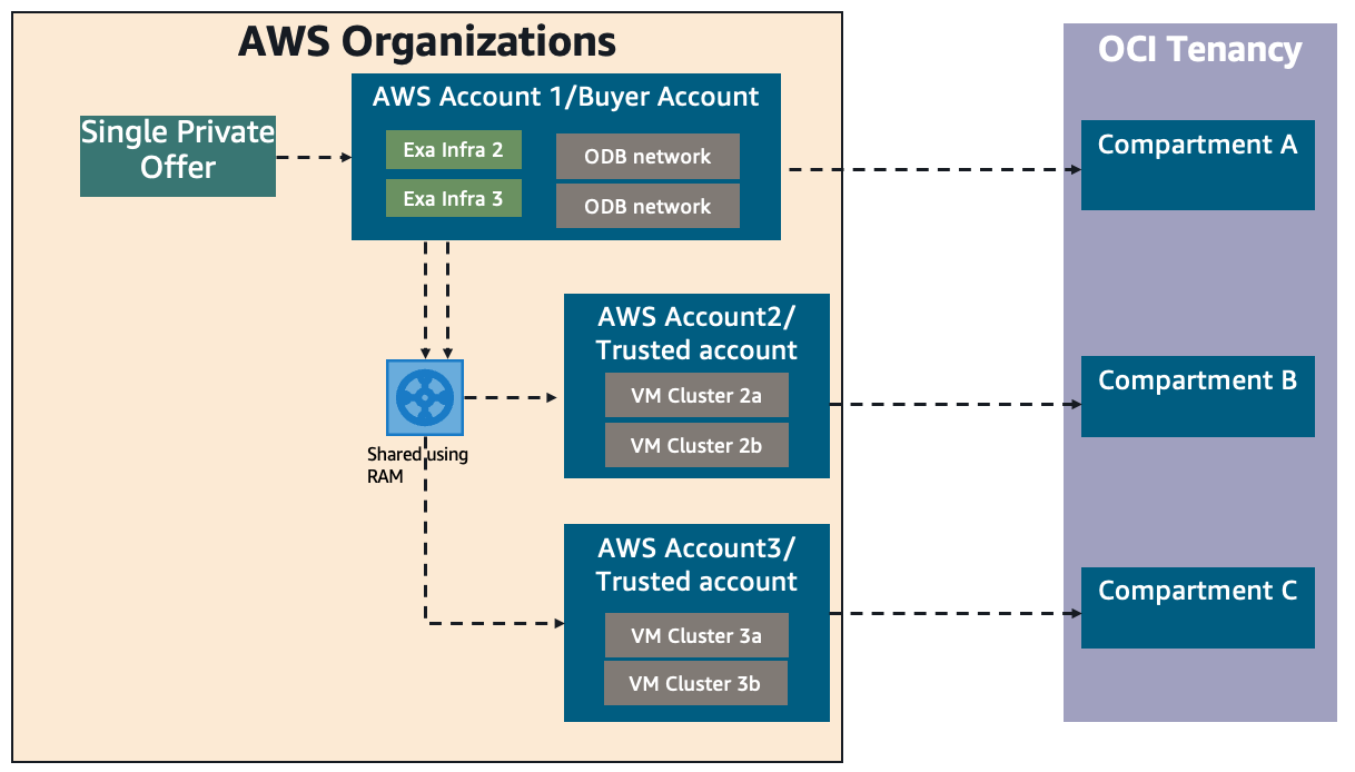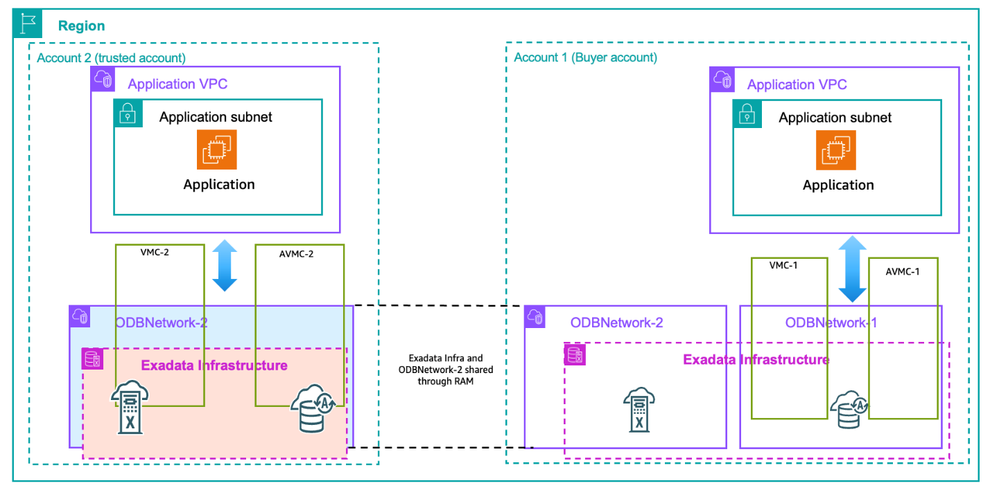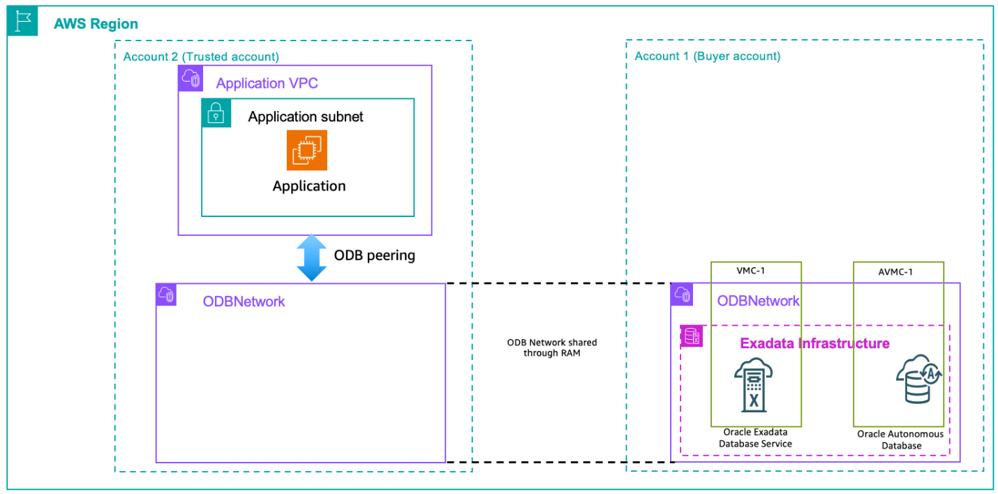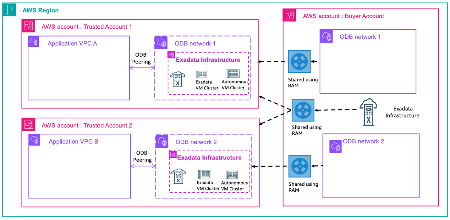 AWS Resource Access Manager (AWS RAM) sharing allows you to share Exadata infrastructure and ODB network resources across multiple AWS accounts within the same AWS organization.