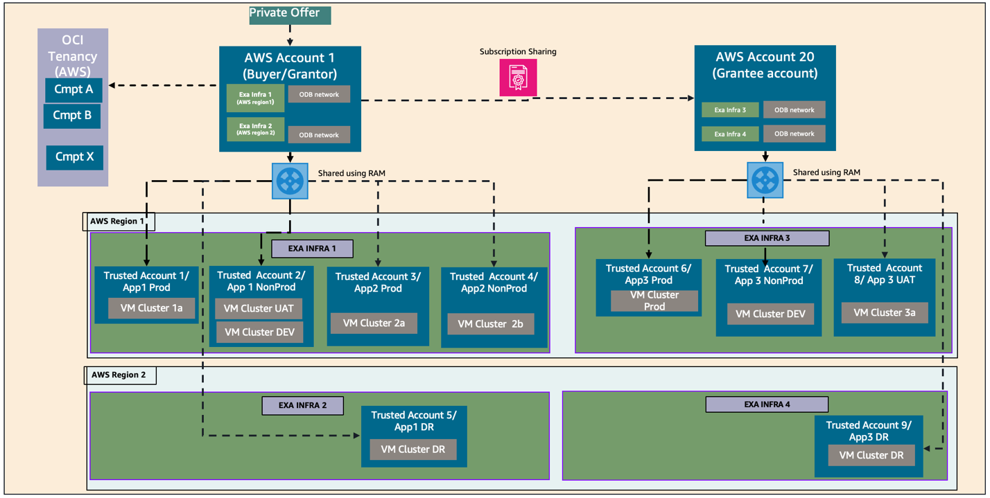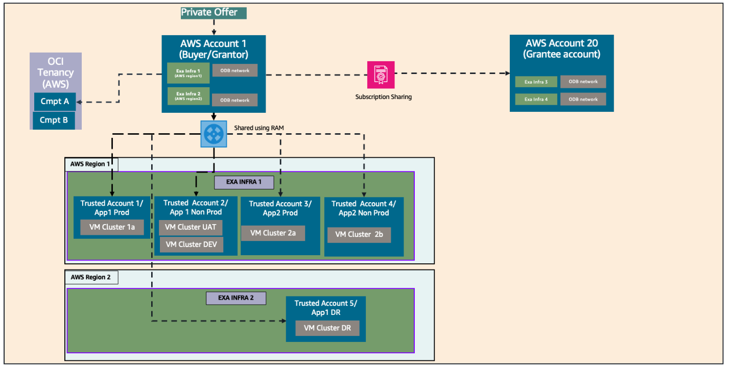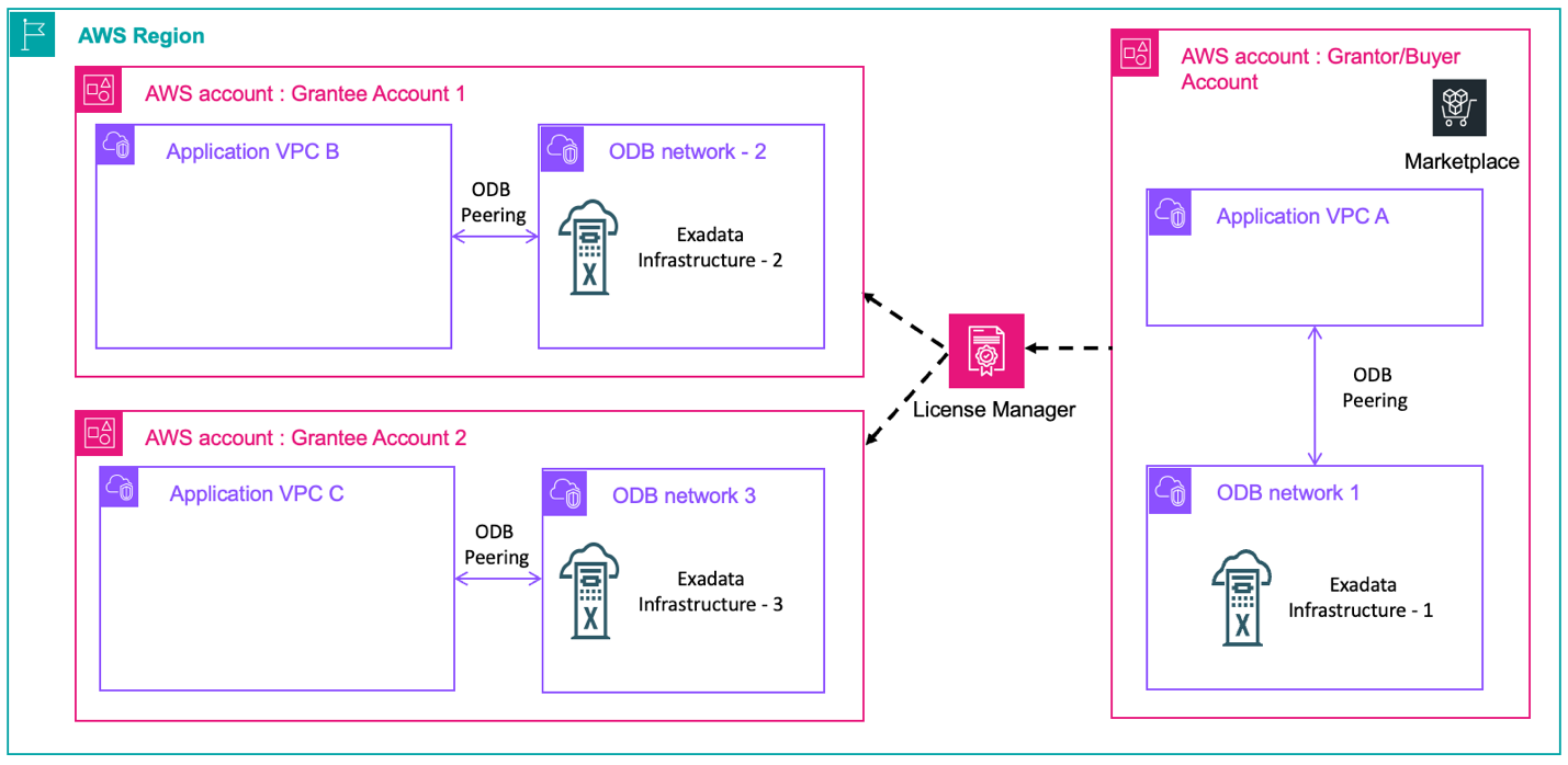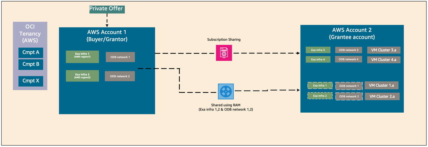 The AWS Marketplace seller private offer feature enables you to request and receive Oracle Database@AWS pricing and EULA terms from Oracle. Refer to the onboarding section for step-by-step instructions on how to request and purchase ODB@AWS in AWS Marketplace. With the Marketplace entitlement sharing option, you can share Oracle Database@AWS subscription and entitlement across AWS accounts in the same AWS organization. The buyer (grantor) AWS account shares the entitlement to grantee AWS accounts through AWS License Manager. The grantee accounts then provision their own ODB network, Exadata infrastructure, VM cluster, Autonomous VM cluster, and databases in their own accounts.
