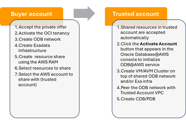 | AWS RAM sharing | Entitlement sharing | Create ODB network | Create Exadata Infrastructure | Create Exa-VMC/AVMC | |