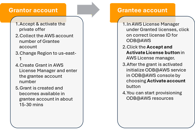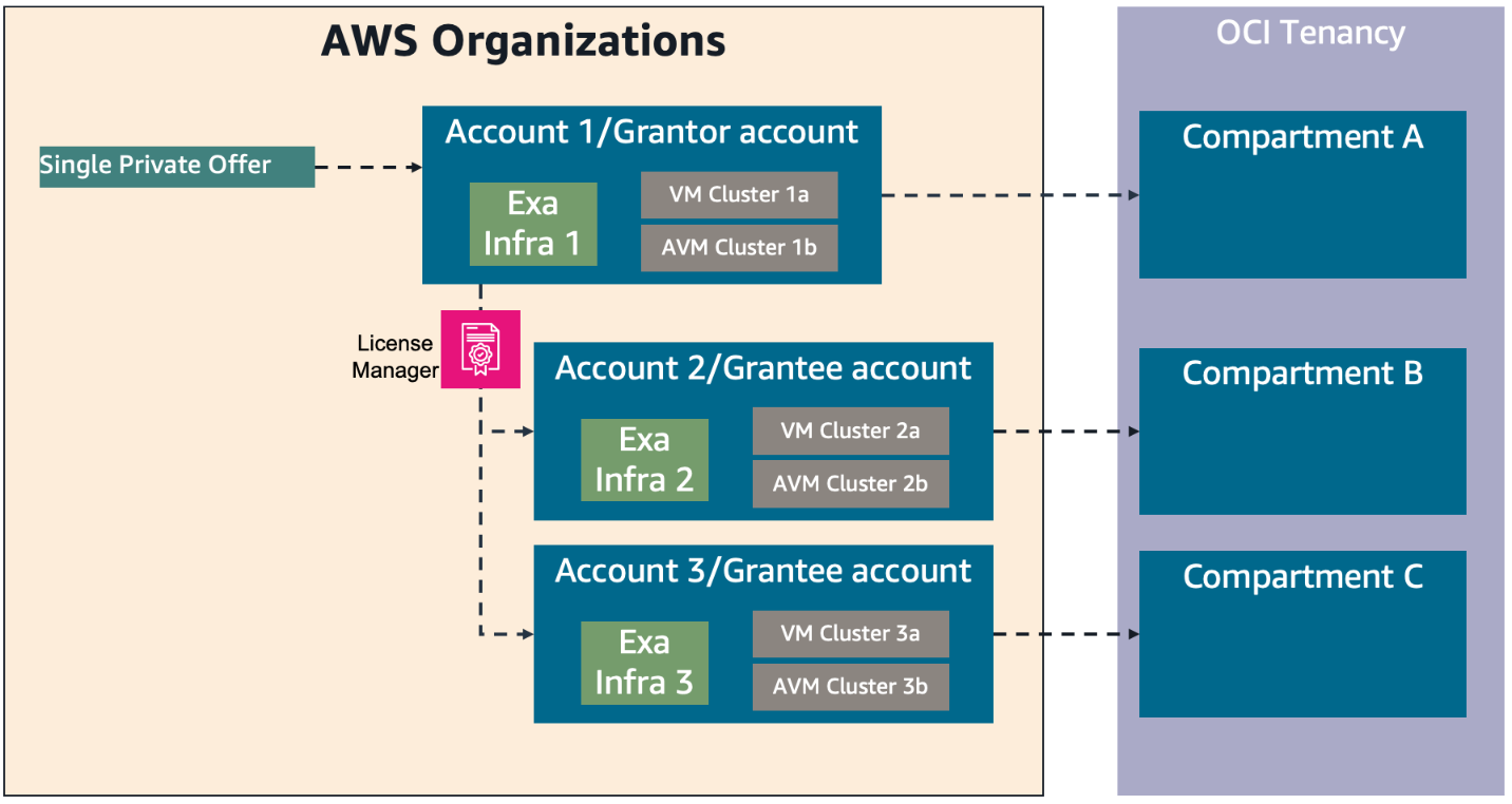 Grantor account: This is the AWS account that owns and shares anOracle Database@AWS subscription through AWS License Manager to the grantee account. The grantor account is typically the account that accepted the Oracle Database@AWS private offer through AWS Marketplace. By creating a grant in AWS License Manager, the grantor account enables one or more AWS accounts within the same AWS Organization to share the Oracle Database@AWS subscription.