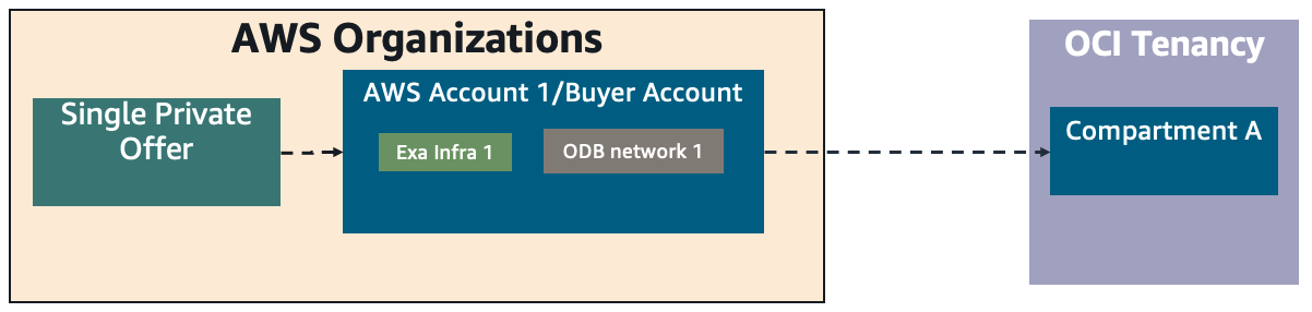 In this case, you can deploy Oracle Database@AWS resources in a single AWS account. As part of this multicloud link configuration, each AWS account has a dedicated compartment inside the linked OCI tenancy. The buyer account can deploy their choice of the Oracle Database@AWS services.