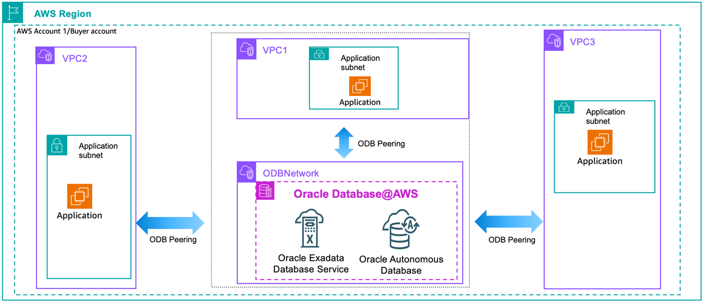 In the following architecture patterns, ODB@AWS resources including ODB network, Exadata infrastructure, VM cluster, and databases are deployed and owned by the buyer account that accepted the Marketplace offer. In Figure 1, the applications that connect to the Oracle database are in multiple VPCs in the same account and are directly peered using ODB peering.