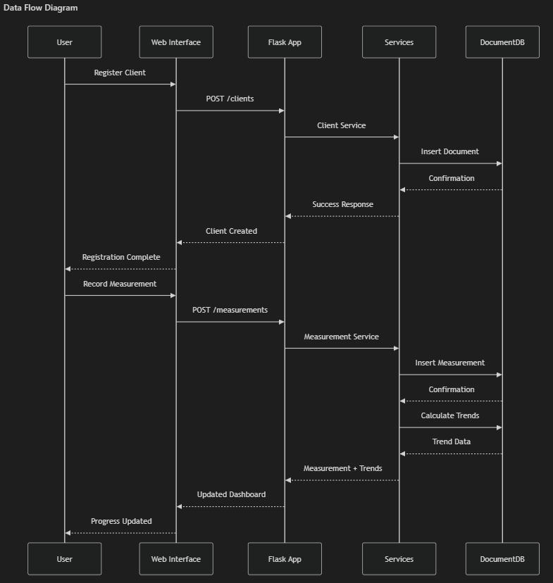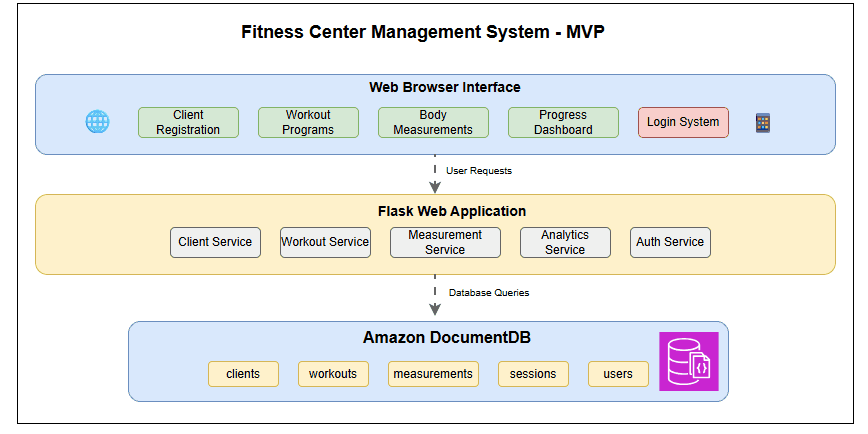 We chose Amazon DocumentDB as our backend database due to its schema flexibility and real time aggregation capabilities. Fitness data is inherently complex and varies significantly between clients. This complexity stems from the diverse nature of fitness metrics—ranging from basic measurements like weight and body fat percentage to advanced biometrics such as VO2 max, heart rate variability, and muscle-specific strength assessments. Additionally, workout structures can vary dramatically, from simple cardio sessions to complex multi-phase strength training programs with varying sets, reps, weights, and rest periods. Amazon DocumentDB stores workout programs with nested exercise structures, flexible body measurements that can include custom metrics for each client, and complex progress tracking data, all in a natural JSON format.