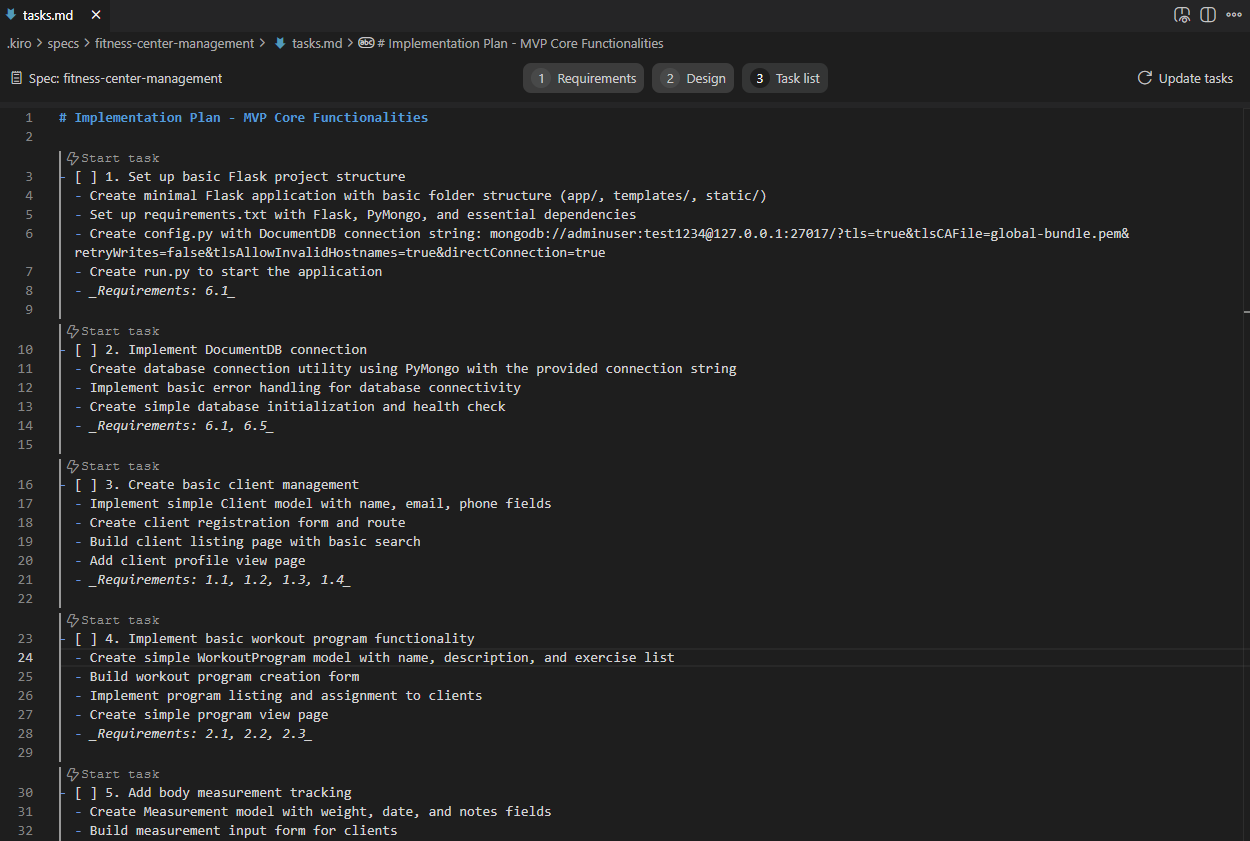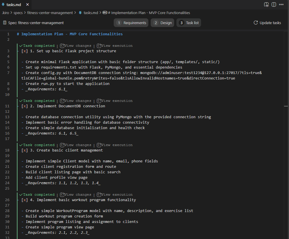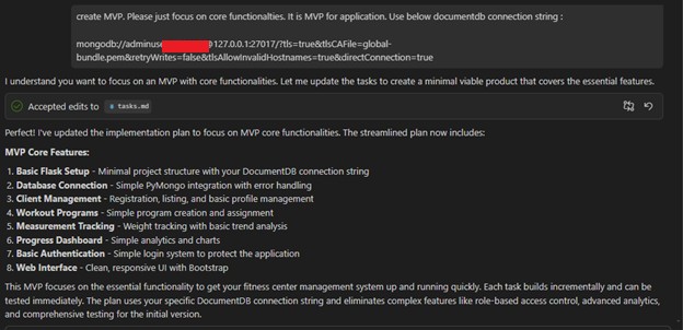 Once we approve the design, Kiro moves to implementation planning. Kiro converts the design into actionable implementation plan. Kiro creates a development plan with 15 main tasks with logical sub-tasks, following a test-driven approach that builds incrementally. When requesting an MVP version, Kiro simplifies the implementation plan while preserving core functionality. We also passed on the Amazon DocumentDB connection string to use as Kiro use test-driven development approach and build incrementally. The Amazon DocumentDB connection string points to a local host as we already set up the SSH tunneling as a prerequisite.