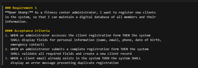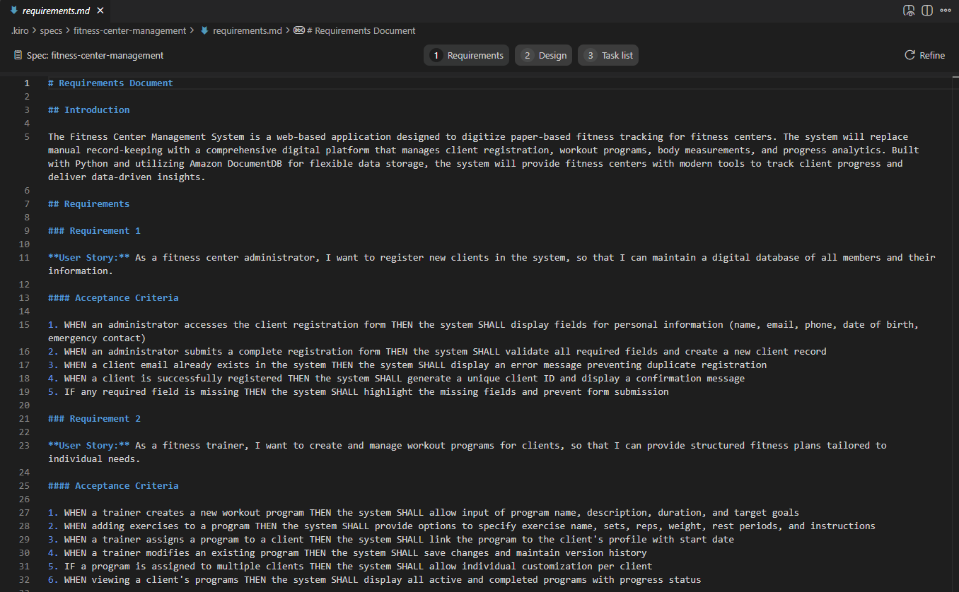 Kiro automatically generates comprehensive requirements in EARS format (Easy Approach to Requirements Syntax). In our example, it created total six requirements for our fitness center management system.