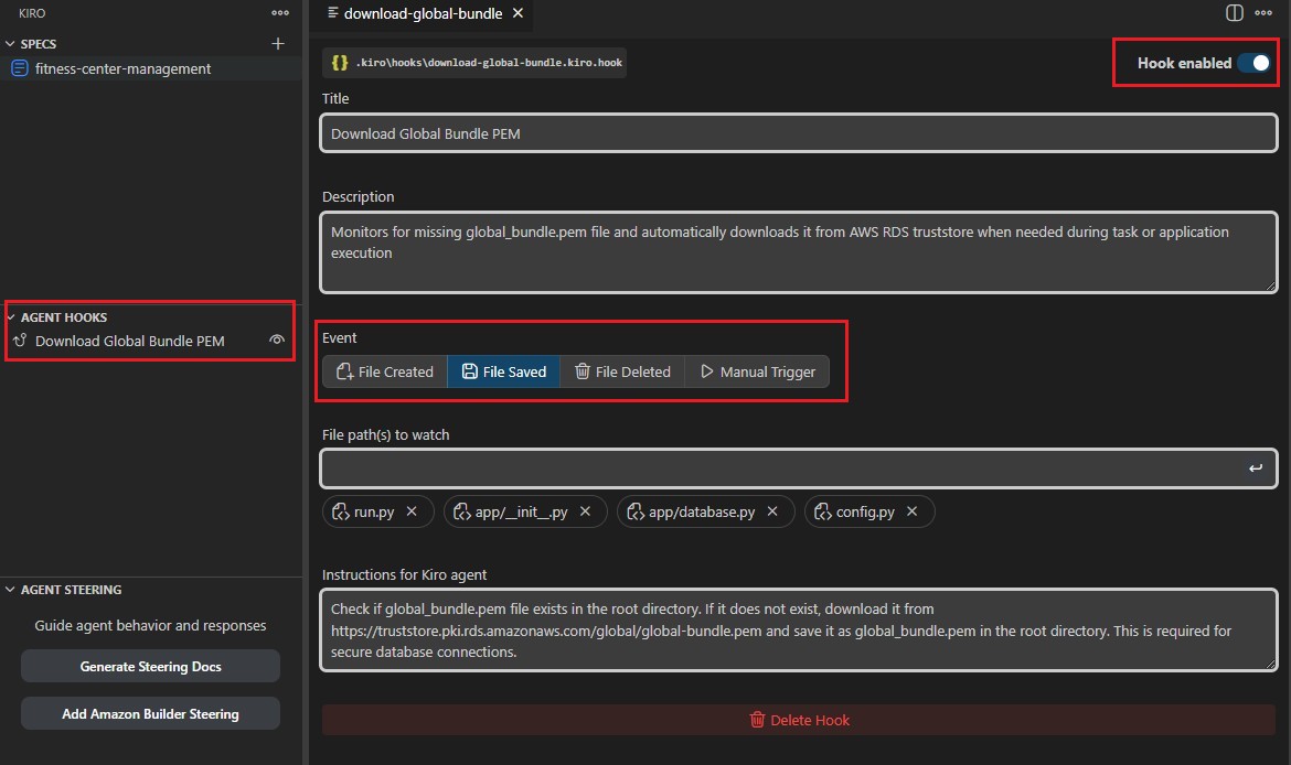 One of Kiro’s powerful features is Hooks – automated actions triggered by events. For our fitness center system, we implemented a critical infrastructure hook: