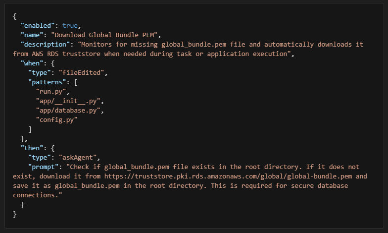 Trigger: When database-related files are edited (run.py, database.py, config.py) Action: Downloads the Amazon DocumentDB global bundle certificate if missing