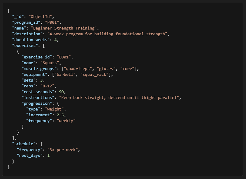 The design uses the document-based structure of Amazon DocumentDB to handle complex fitness data relationships. The following are a few samples from design documents.