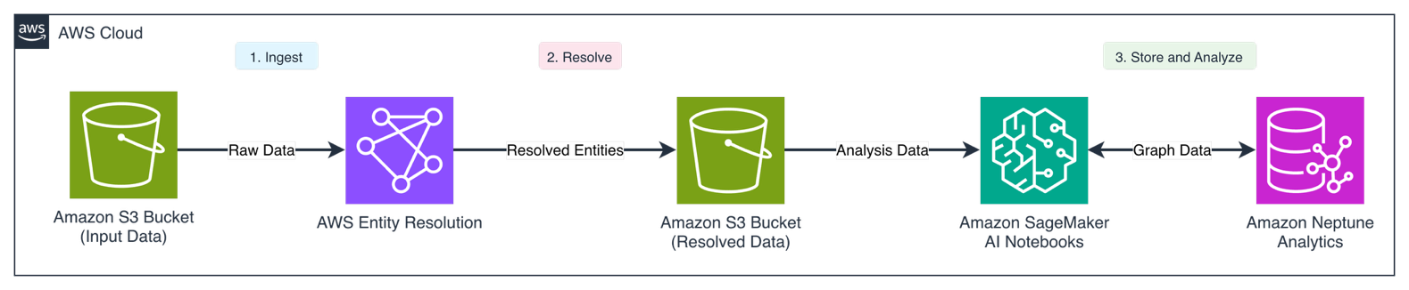AWS Entity Resolution ingests customer data from various sources, standardizing and matching records to create a single view of the customer with a persistent identifier. The persistent customer identifier, customer attributes, and transactions are then loaded into Neptune Analytics as vertices, and relationships between each entity form the edges of the graph. Amazon Neptune Workbench hosted Amazon SageMaker AI notebooks provide the environment for investigators to assess the data. For more details, see Accessing the graph.
