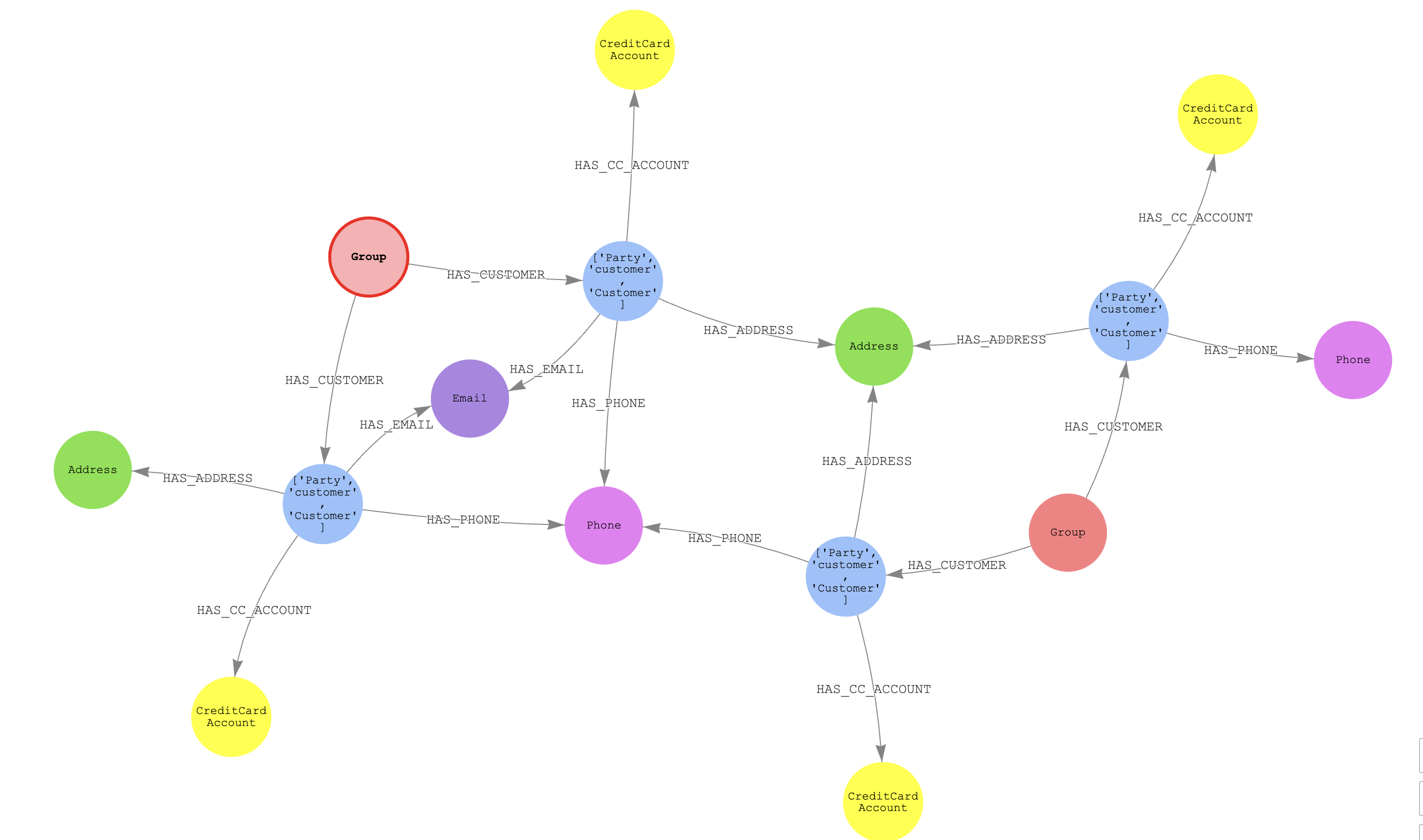 For visualization purposes (comment out the where not statement), we can see two distinct Group nodes and four parties. The two groups have a differing email address, phone, and address that are not shared. This suggests that the two resolved entities might be related, because they have shared the same number and at least one address.