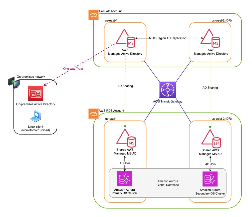 Note: Although this solution applies to multiple Amazon Aurora and Amazon RDS database engines, this post uses Amazon Aurora Global Database for MySQL to walk through the implementation steps. If you are using a different engine, such as Aurora PostgreSQL or Amazon RDS, you can follow the same overall approach and tailor the engine-specific steps (such as the MySQL client version, Kerberos plugin configuration, and database user creation syntax) accordingly.