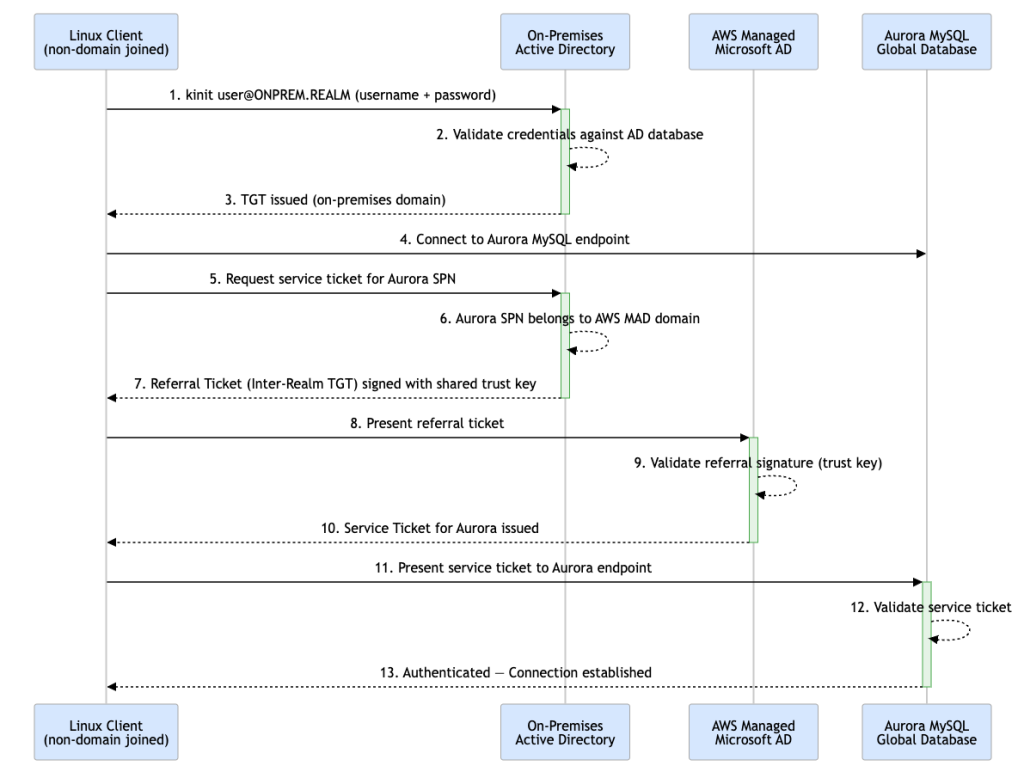 Kerberos is a network authentication protocol that allows clients and services to verify each other’s identities securely over untrusted networks. This allows Amazon Aurora MySQL to integrate with centralized authentication services such as Microsoft Active Directory, which natively supports Kerberos. The authentication process uses a one-way forest trust relationship where AWS Managed Microsoft AD trusts the on-premises AD.The Kerberos authentication workflow consists of the following steps: