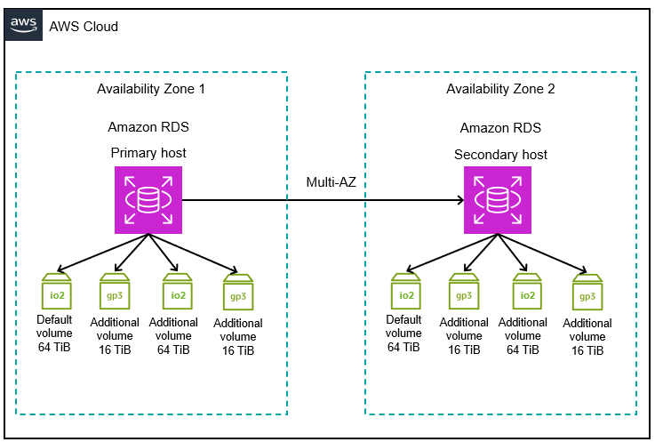 The following architecture diagram illustrates the additional storage volume configuration, showing the use of primary and secondary hosts, each with two volumes, in a multi-Availability Zone (multi-AZ) configuration.