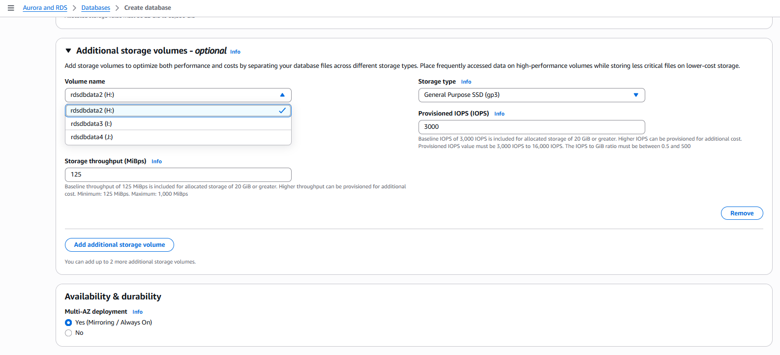 You can add up to three additional storage volumes either during instance creation or after an instance has been deployed. Additional storage volumes supplement the default storage volume. The default volume uses D:\ as its drive letter. Additional storage volumes support two storage types: General Purpose SSD (gp3) and Provisioned IOPS (io2), so you can choose the optimal storage performance for your database workloads. Volume names are mapped to windows disk letters as follows:
