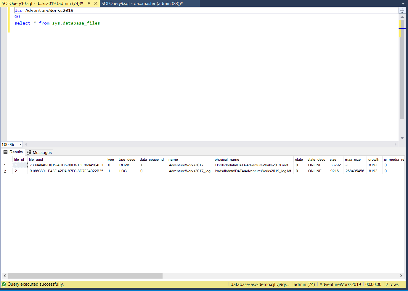 AdventureWorks2019on additional storage volumes. You can download a sample backup from AdventureWorks2019. Replace<bucket-name>with an appropriate value.See Importing and exporting SQL Server databases using native backup and restore for instructions to perform a database restore into an RDS for SQL Server instance. The command assumes you have configured additional storage volumes named