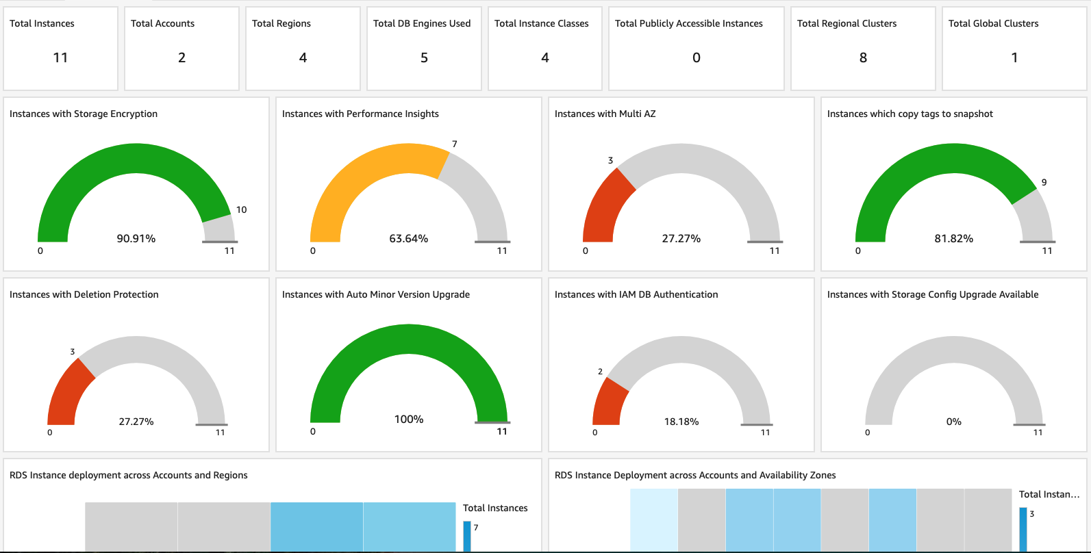 With a consolidated view, you can view various aspects of your Amazon RDS fleet, from high-level metrics such as total instance counts and engine distributions to detailed configuration elements such as encryption status, backup retention periods, and maintenance windows. The following screenshot shows example metrics in a Quick Suite dashboard.