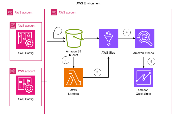 For detailed instructions about setting up the environment for AWS Config data, see How to query your AWS resource configuration states using AWS Config and Amazon Athena and Visualizing AWS Config data using Athena and Quick Suite.