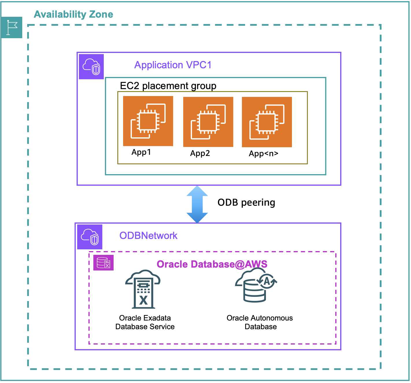 ODB@AWS high performance networking uses Amazon EC2 placement groups to place your application instances in close physical proximity to your Oracle Exadata infrastructure within an AWS Availability Zone (AZ). This proximity minimizes network hops and reduces latency variability. This delivers consistent and predictable network performance for SQL*Net traffic between Oracle clients (applications hosted on EC2/ECS and EKS) and the Oracle Database server running on ODB@AWS.