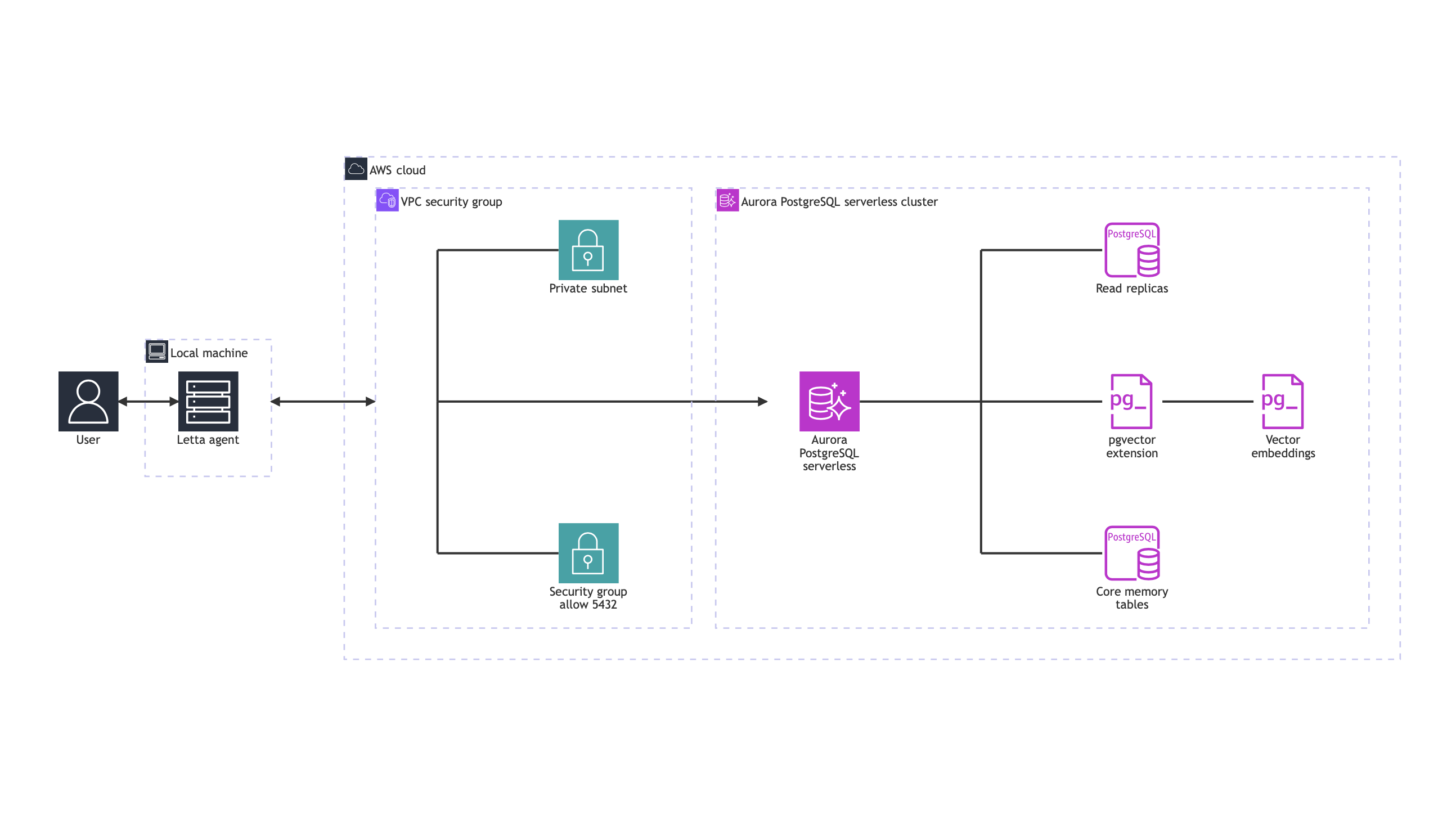 This integration enables production deployments of Letta with the scalability, durability, and high availability that Aurora provides. For production use, consider implementing additional security measures such as AWS Identity and Access Management (IAM) database authentication, encryption at rest, and restricting security group access to specific IP ranges or VPC configurations.