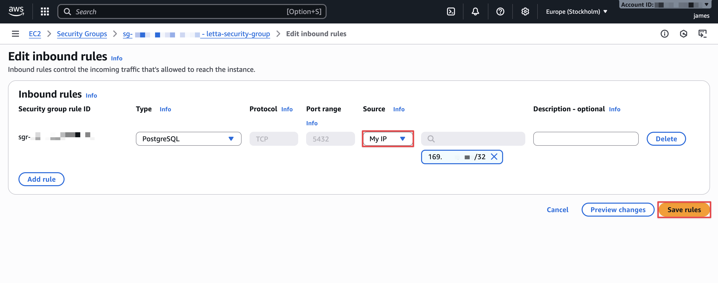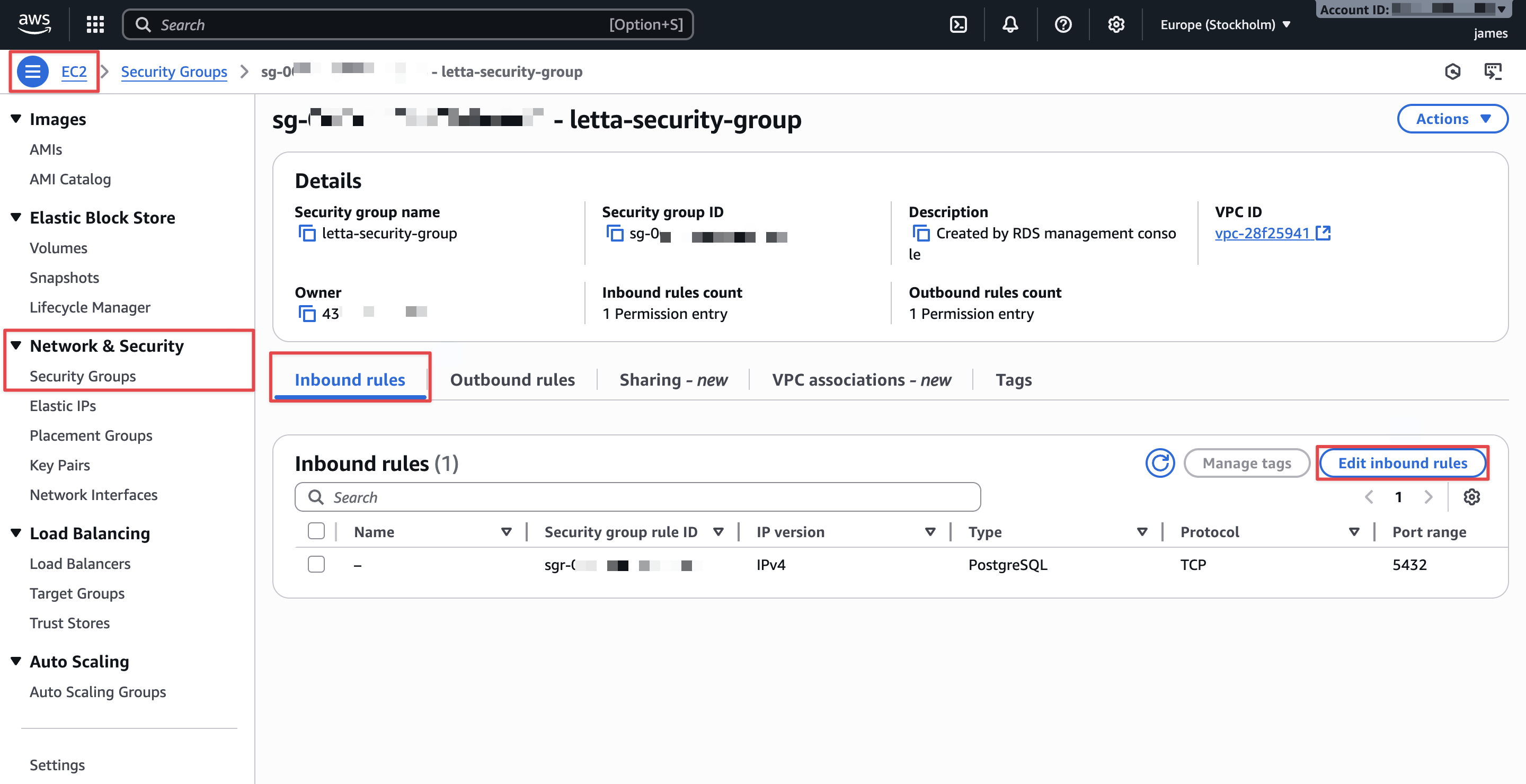 letta-aurora-sg). - Choose Edit inbound rules.