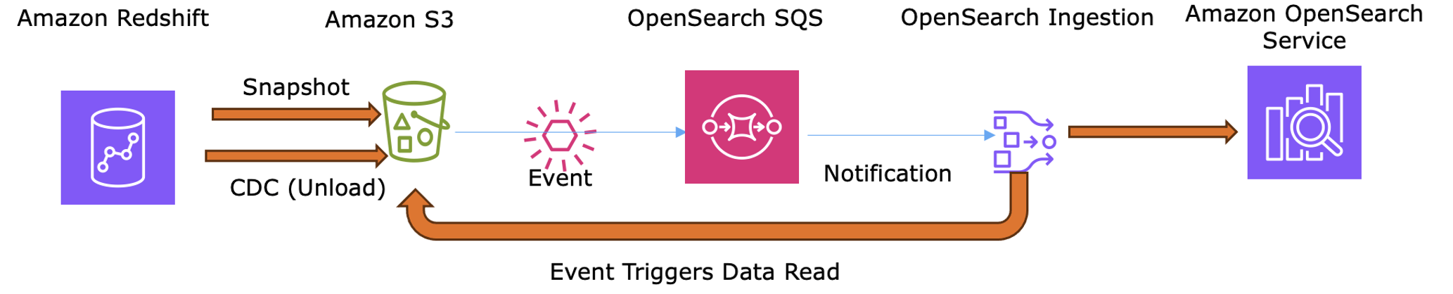 UNLOADcommand to export pre-computed trending scores (movie_id,trend_rank) to S3, sending only aggregated results rather than raw viewing data. - Scheduled sync – Since Redshift lacks native CDC, OSI uses the S3 source plugin to ingest these exported files on a scheduled basis (