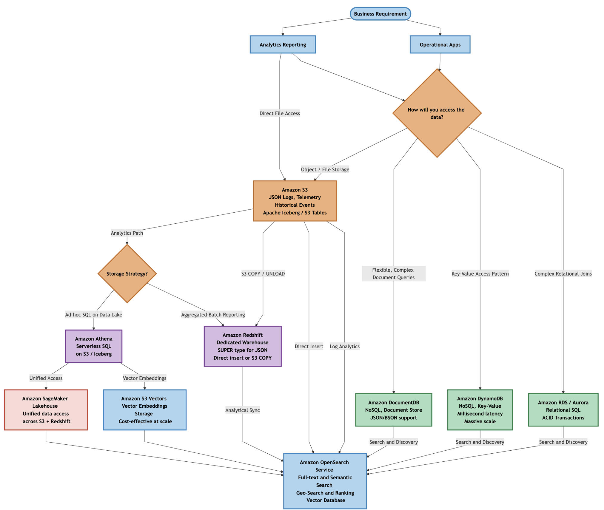 The following decision tree (select to enlarge) illustrates one approach to selecting AWS services based on your data access patterns and workload requirements. For operational applications, choose between Amazon relational databases (Amazon Aurora or Amazon RDS), document stores (Amazon DocumentDB with MongoDB compatibility), or key-value stores (Amazon DynamoDB) depending on data structure, scaling requirements, query complexity, and latency needs. You feed all primary data stores into the semantic and discovery layer, Amazon OpenSearch Service for full-text and semantic search, and Amazon Simple Storage Service (Amazon S3) Vectors for cost-effective vector embedding storage. Meanwhile Amazon S3 serves as the foundational data lake layer feeding analytical tools like Amazon Redshift and Amazon Athena.