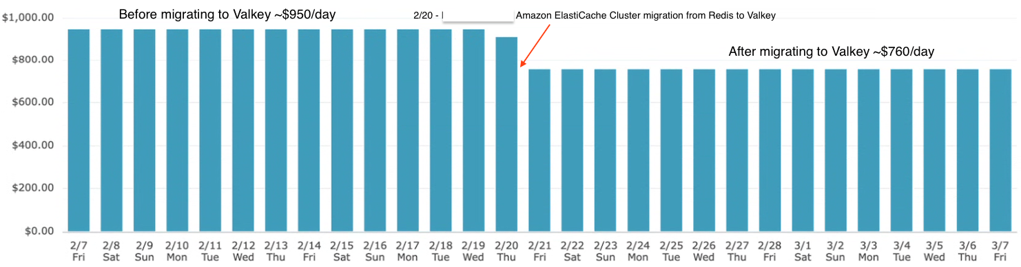 The following graph shows the cost of running ElastiCache clusters before and after migrating to Valkey, showing 20% daily savings.