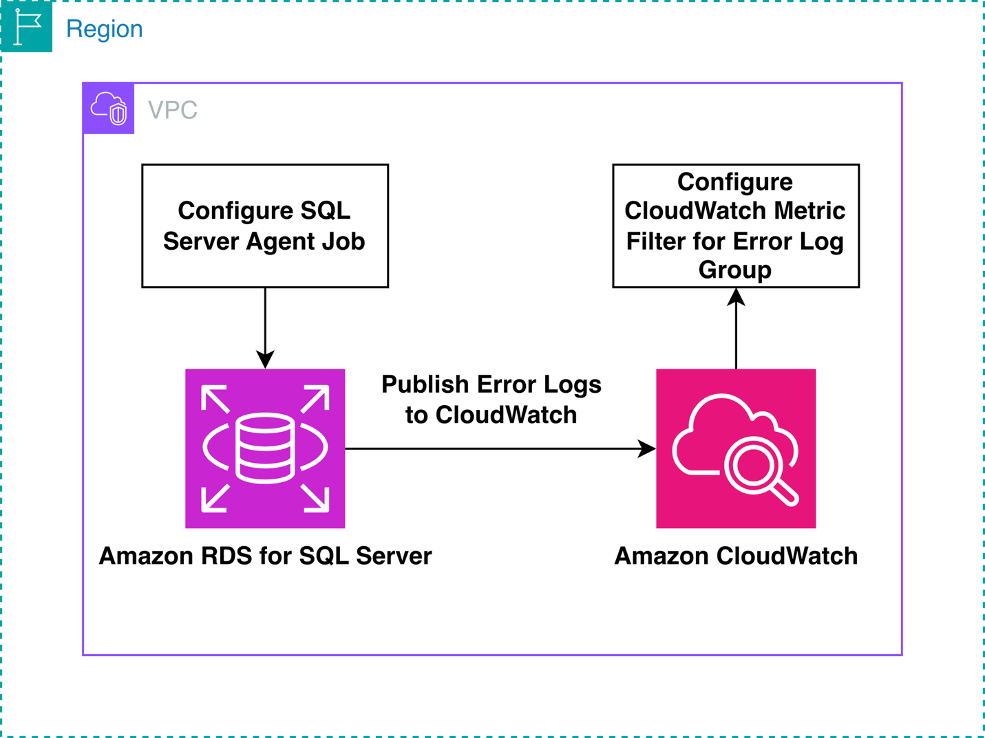 The following diagram shows the flow from RDS for SQL Server to CloudWatch