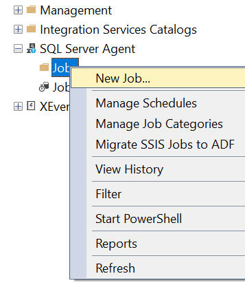 - In SQL Server Management Studio (SSMS), create a new SQL Server Agent Job.