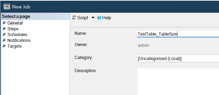 Next, create the SQL Server Agent Job that gathers the table size and writes it to the RDS SQL Server error logs.