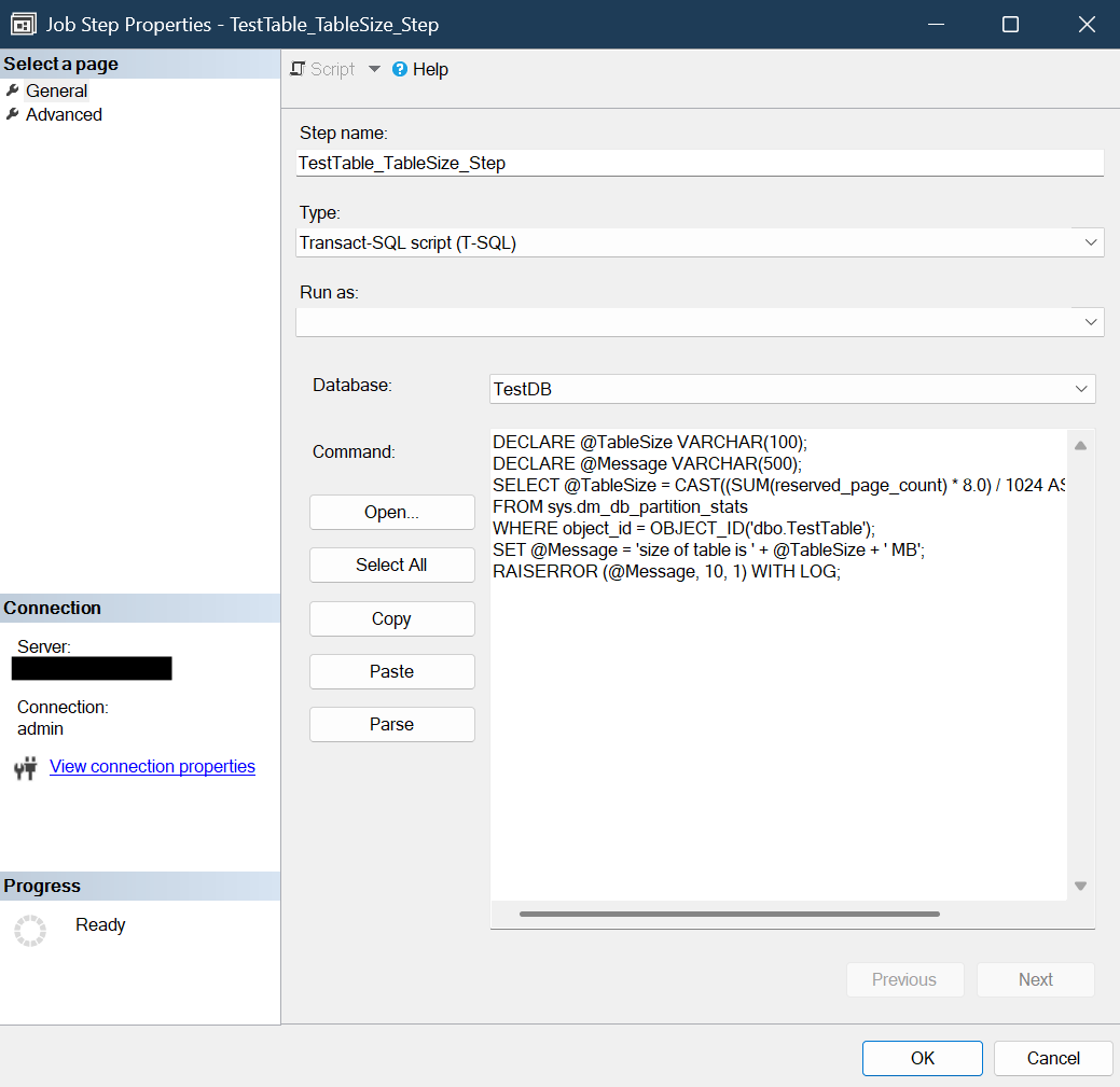 - Provide a Step Name and the TestDB Database Name we previously created, and paste the following script in the Command Box: