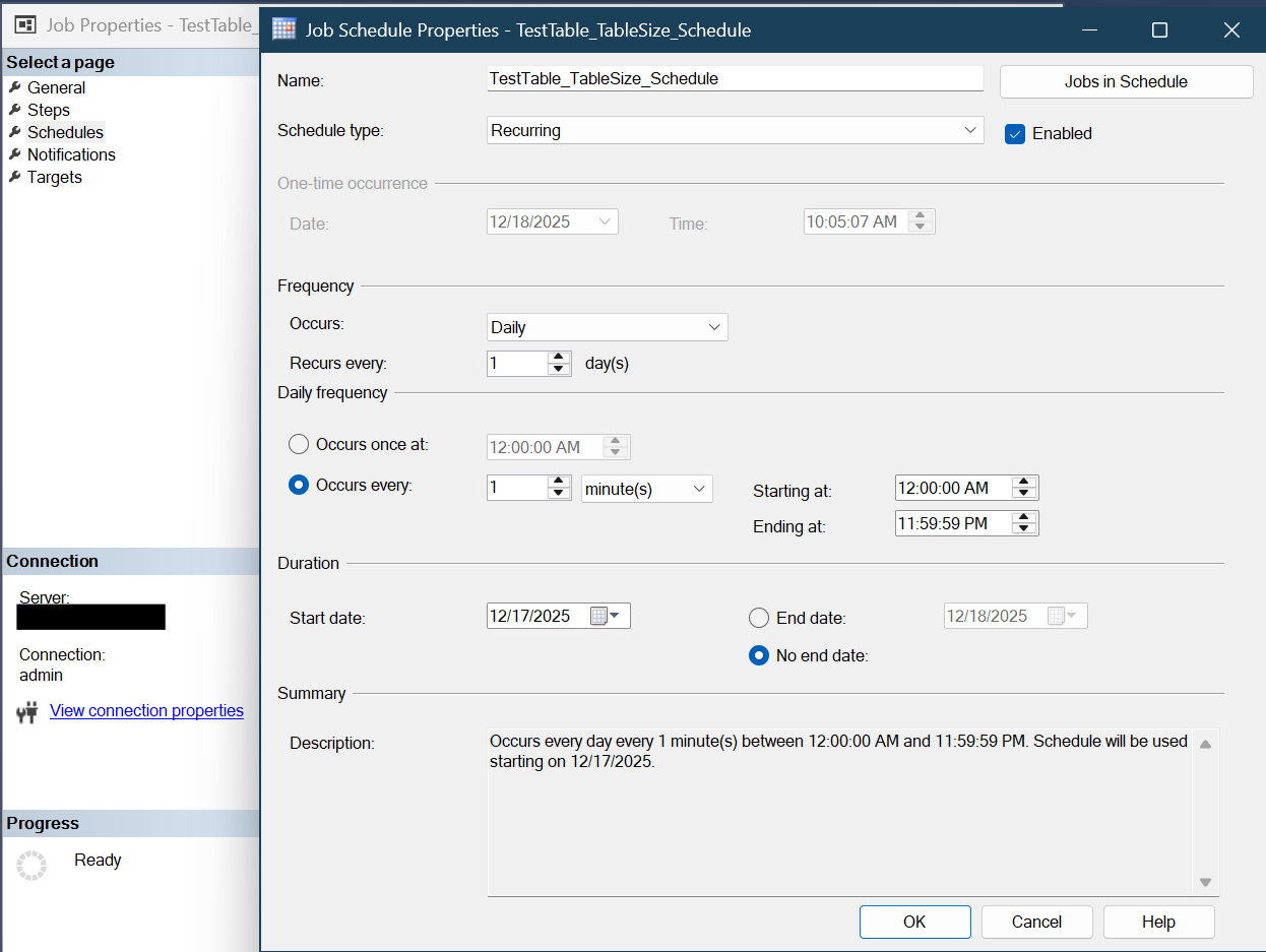 - Select OK, and then OK again to save the New SQL Server Agent Job.