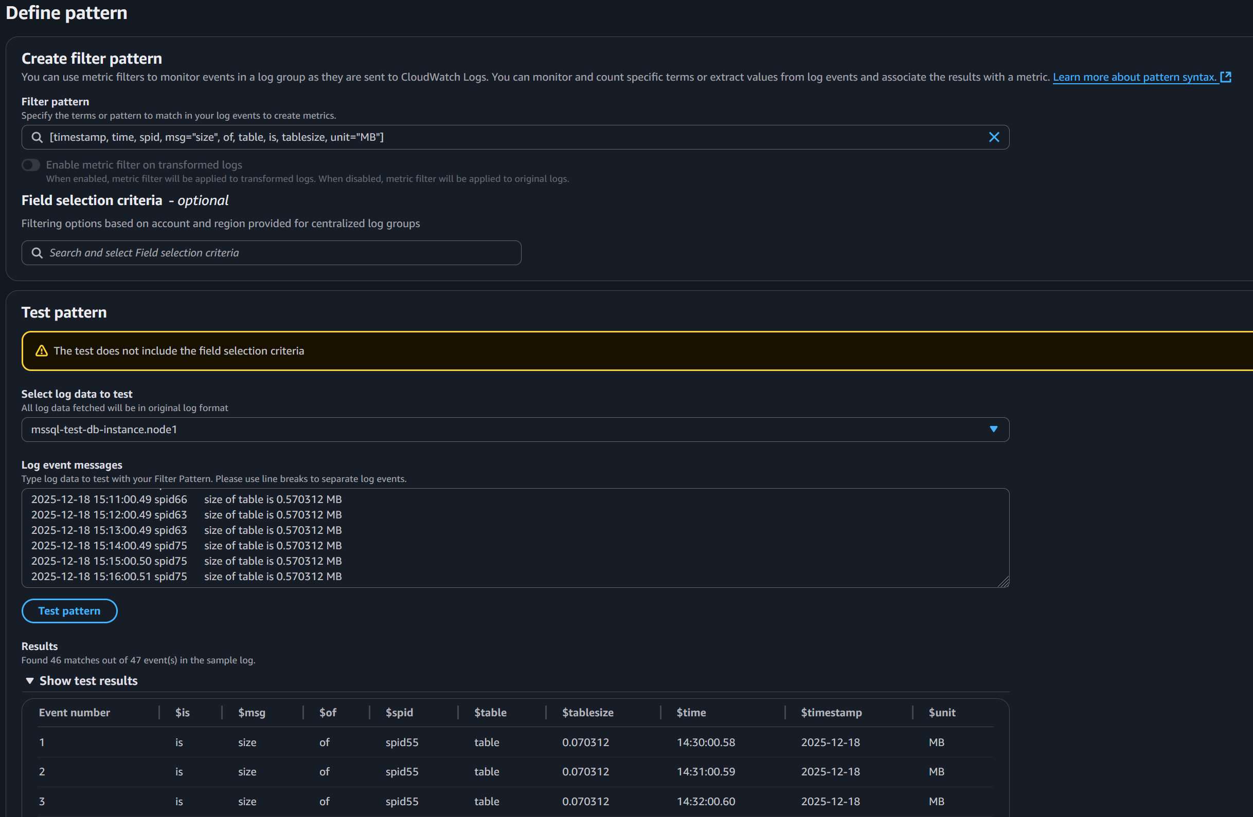 - For Select log data to test, you can select your DB Instance node, which will show its log event messages, and then select Test Pattern to test with the filter pattern.