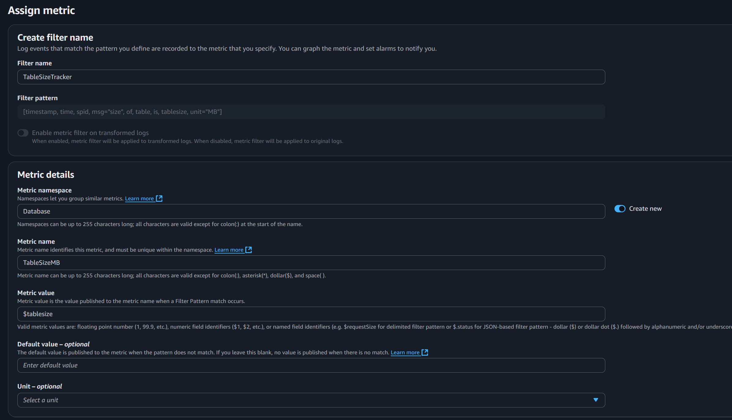 TableSizeTrackeras the Filter Name,Databaseas the Metric namespace, andTableSizeMBfor the Metric name. For the Metric value, we use$tablesizeto retrieve the table size from the logs and publish it to the Metric.