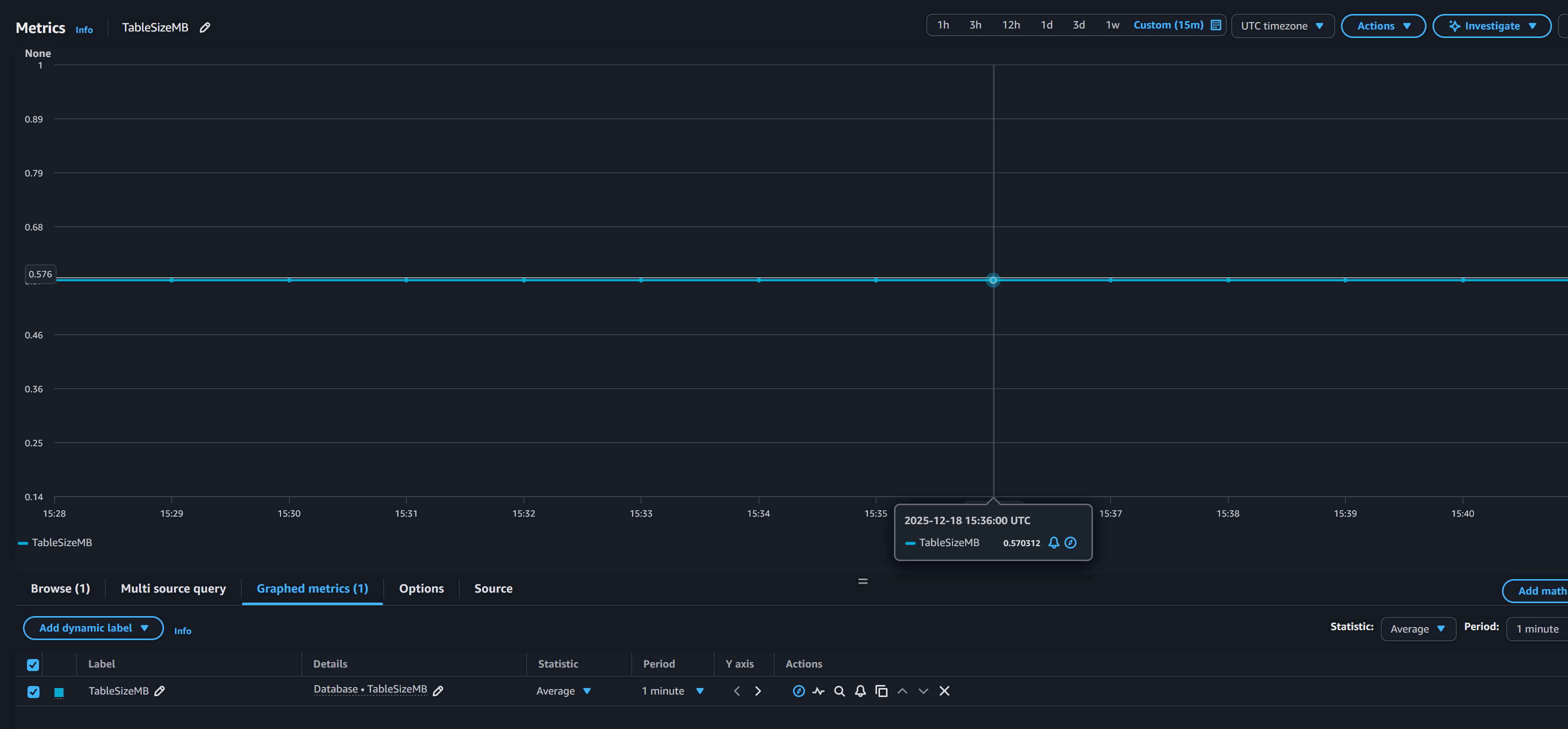 Now, we can check and confirm Cloudwatch publishes the metric of the table size value. Wait a few minutes for CloudWatch to generate the namespace and metric.