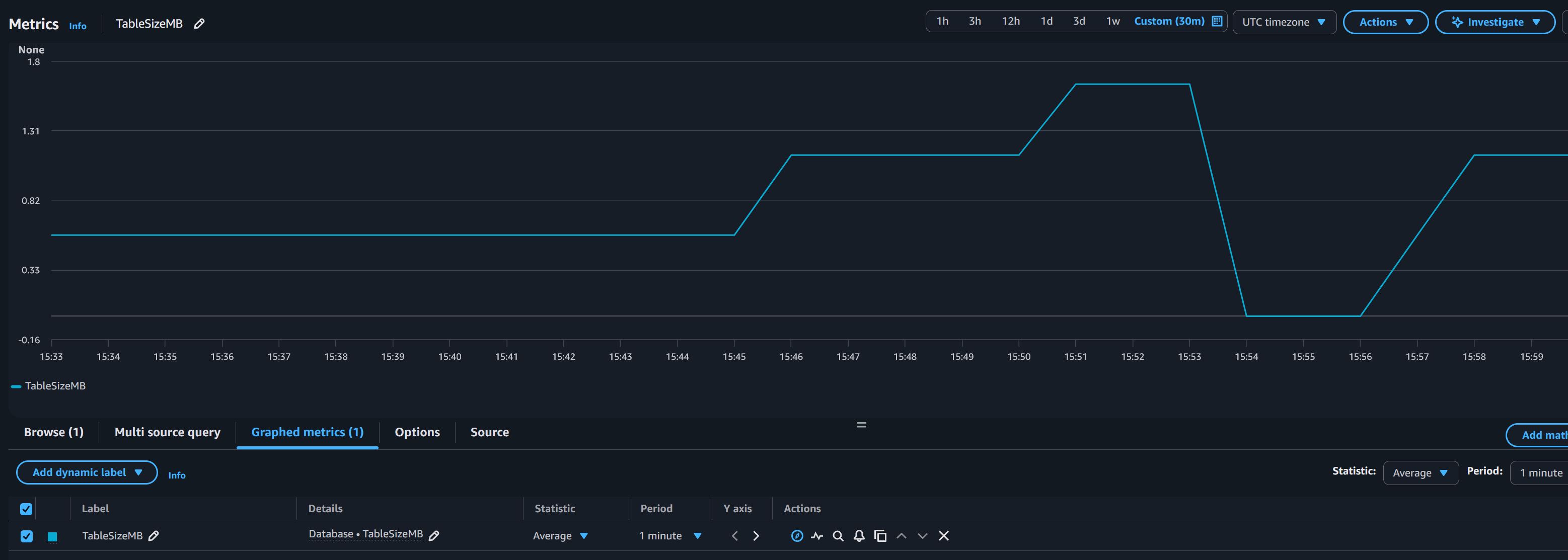 You can also rerun the command from the Populate the Table section of this post, as well as truncate the table to confirm that the table size is being reflected in Cloudwatch.