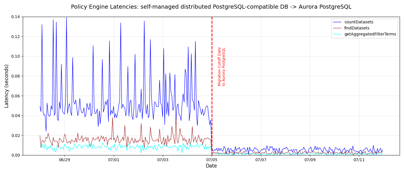 The Online Data Stores (ODS) team is one such group, managing persistent data store solutions across the organization. They evaluate developer requirements, assess production workloads, and provide subject matter expertise for data store decisions. In this post, we examine the technical and operational challenges encountered by the ODS team with their current self-managed distributed PostgreSQL-compatible database, the evaluation criteria used to select a database solution, and why they chose to migrate to Amazon Aurora PostgreSQL-Compatible Edition to meet their current and future performance needs. The migration to Aurora PostgreSQL improved their database infrastructure, achieving up to 75% increase in performance and 28% cost savings across critical applications: Spinnaker achieved 50% average latency reduction and Policy Engine reduced average latency by 75% (from 26.72 milliseconds to 6.51 milliseconds).