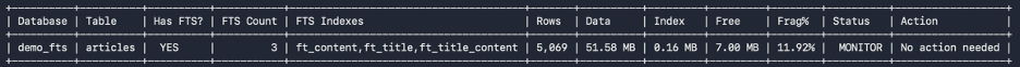 - Check the size of FTS tables before and after each run OPTIMIZE TABLE: