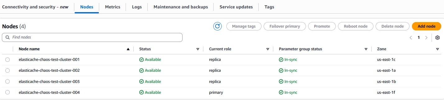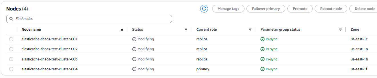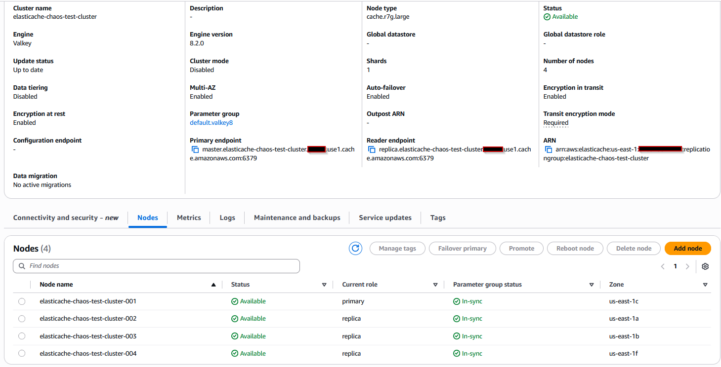 We’re using a cluster mode disabled configuration because it makes the failover process easier to observe in the console — you can clearly see individual node roles change from primary to replica. However, these same testing principles apply to cluster mode enabled deployments, where the configuration endpoint automatically manages routing across all shards. This experiment isn’t supported on ElastiCache Serverless, which handles Multi-AZ failover behind a managed proxy so applications experience no disruption. Refer to the documentation on how ElastiCache Serverless works.