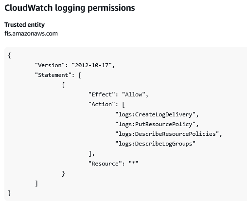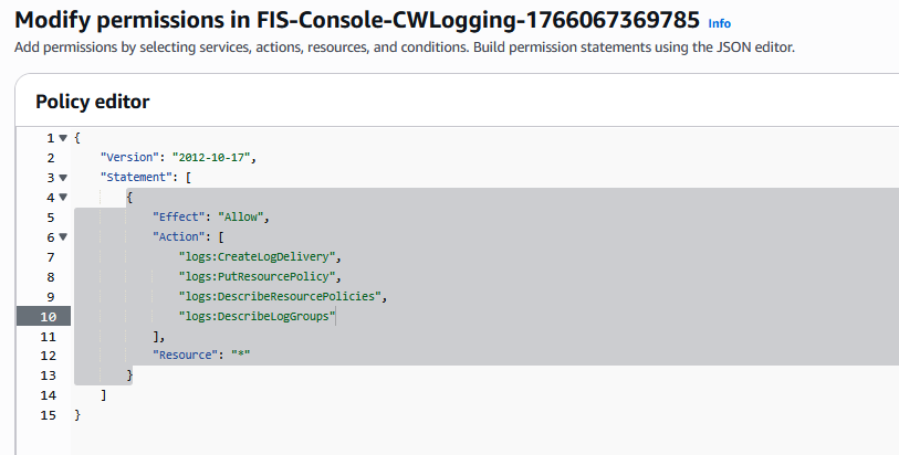 Once the template has been created, we need to edit the IAM role we created so that it does have the necessary permission required for CloudWatch logging. Open the IAM console, choose the IAM role and under this role, you will see two policies attached. Edit the policy created with name FIS-Console-CWLogging-XXXX and copy the previous policy JSON document, then save the policy.