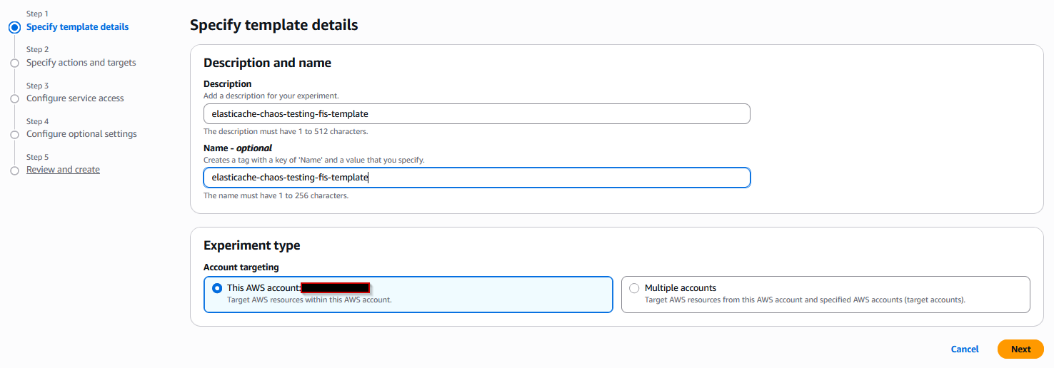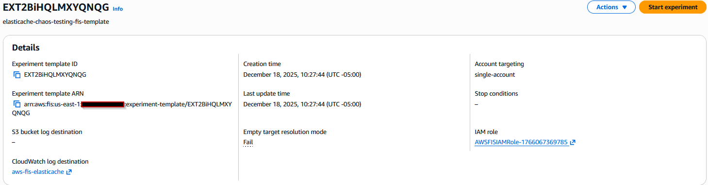 When your Amazon ElastiCache cluster is ready and available, you’ll create an AWS FIS template as below that defines what failure to inject and which resources to target .