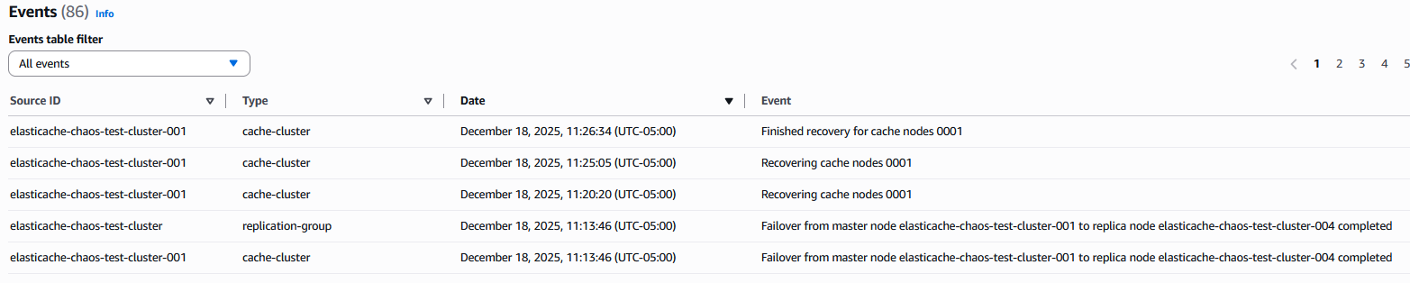 ElastiCache events provide visibility into cluster health during failover. Key events to verify:
