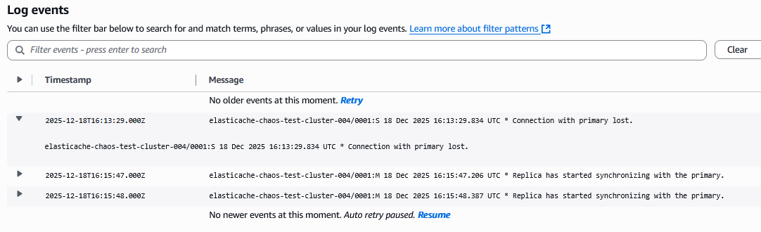 The failover was completed within a few seconds after the action-start time as per the AWS FIS logs in the log group aws-fis-elasticache. If you have enabled the logs of the Amazon ElastiCache cluster, you will see the logs of other nodes showing connection issue with the primary node as well.