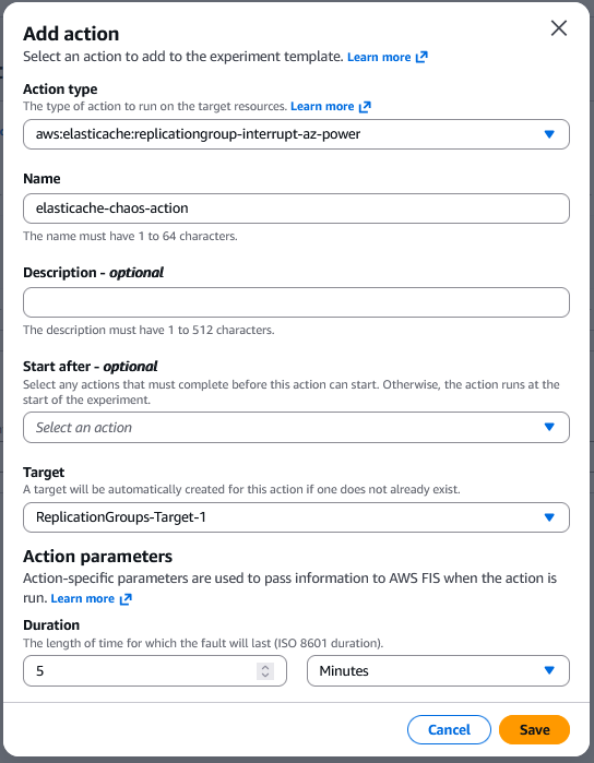 aws:elasticache:replicationgroup-interrupt-az-powerto interrupt power to nodes in the specified Availability Zone for target ElastiCache replication groups with Multi-AZ enabled. - Give a relevant Name as required.