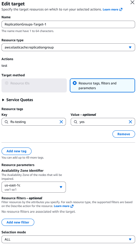 aws:elasticache:replicationgroupto open the Edit Target page. - In the Target method, you will see Resource tags, filters and parameters radio-button already selected. To target Amazon ElastiCache, we can only specify tags in the