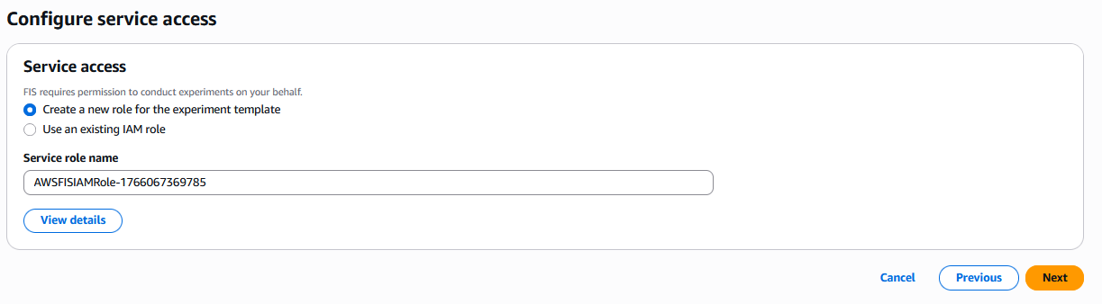 - In the Service access section, keep the default selection to Create a new role for the experiment template. Copy the service role name shown on your console, as we will use it later. Once this step is completed, it creates an IAM role with the name as shown in your console.