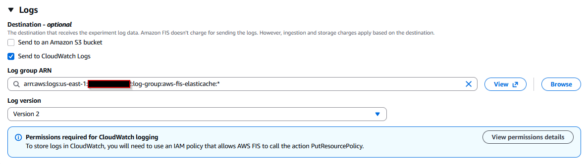 - On the AWS FIS tab of template creation, choose Browse option in the Logs section, then use the Refresh button at the right side.