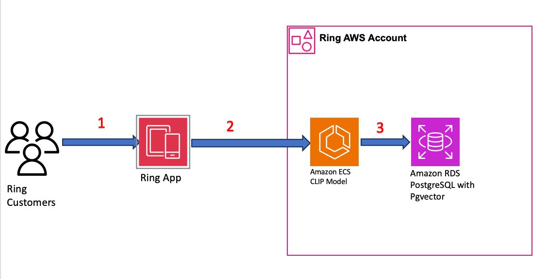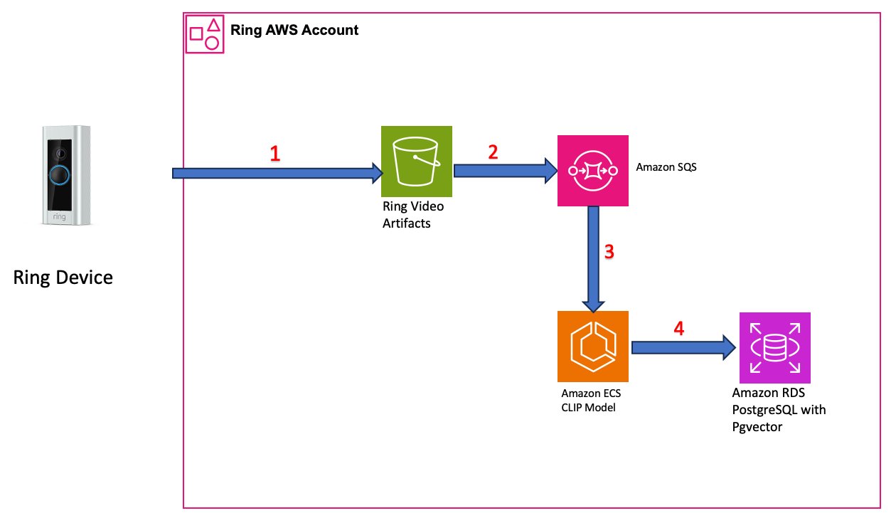 The AI Video Search uses the Contrastive Language-Image Pre-training (CLIP) model to enable you to search video footage using natural-language queries. While CLIP is a model that supports multiple input modalities (text and images), Ring’s implementation specifically uses the model to generate vector embeddings from video frames captured at regular intervals. The system stores embeddings in a database and the embeddings are searched against text-based query embeddings to find the most relevant moments. The architecture uses managed AWS services to process billions of video frames daily while maintaining sub-second query latency.